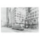 Un vintage tranvía viaja por Market Street en San Francisco, rodeado de edificios altos. El tranvía está en primer plano, con sus ventanas que reflejan el paisaje urbano circundante. Los edificios son una mezcla de arquitectura moderna y antigua, algunos con grandes ventanas y otros con fachadas más tradicionales.