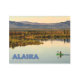 En el interior de Alaska hay una canoa que cubre el agua de un lago que permanece en el espejo. A lo lejos, la típica taiga y las montañas. También aparece el texto "Alaska". Esta imagen se deriva de una fotografía del Servicio de Pesca y Vida Silvestre de los Estados Unidos.
