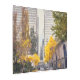 Esta es una vista a nivel de calle de una calle de San Francisco bordeada de árboles en otoño. Los árboles de ambos lados de la calle están pintados de amarillo y verde. En ambos lados se alzan edificios altos con un patrón de ventanas parecido a una cuadrícula, lo que crea un efecto cañón. Los autos están estacionados a lo largo de la curva, y algunos vehículos son visibles manejando por la calle.