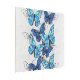 Composición vertical de mariposas morfo realistas, azules y blancas sobre fondo texturado gris. Mariposa morfo azul.