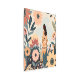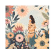 Un ilustracion sereno en el que una mujer vestida con un traje bohemio adornado, se alza en medio de un frondoso jardín de flores de gran tamaño, en un estilo abstracto de bloques de color. El diseño muestra una paleta de colores cálidos y terrenales de terracota, melocotón, marina y verde sabio. Este moderno ilustracion botánico combina elementos de arte folclórico con un diseño contemporáneo, perfecto para los amantes del arte botánico con un toque femenino. Las flores estilizadas y el follaje crean un ambiente de ensueño y capricho al tiempo que mantienen una estética sofisticada.