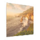 Una impresionante fotografía paisajística captura la hora dorada a lo largo de una escarpada costa en el Parque Estatal Garapatta, California. El sol brilla cálidamente sobre la escena, iluminando las olas que se estrellan y los acantilados rocosos que salen del océano. El agua es de un azul intenso, con cristaleras que forman las olas que rompen contra la orilla. El cielo es una mezcla suave de naranja, rosa y azul, con nubes espesas que aumentan el efecto dramático.