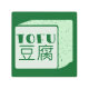 Ilustracion de un cubo de tofu dibujado en un color verde claro. El texto japonés del tofu dice tofu.