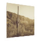 Un paisaje de color sepia presenta un alto cactus de saguaro en primer plano, rodeado de vegetación desértica. El cactus se erige de manera prominente en un telón de fondo de colinas onduladas y un cielo despejado. El tono general es cálido y nostálgico, lo que da a entender el árido suroeste americano. La luz arroja sombras suaves por toda la escena.