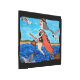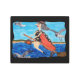 Esta metalizado huella en la pared tiene una bruja graciosa con un traje de baño negro con estrellas y una capa que sobrevuela el océano junto a gaviotas en su escoba con su gato negro colgado en la parte posterior de la escoba sobre un fondo negro ondulado.