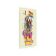Ilustracion litográfico de estilo retro de Harley Quinn sostiene una bandera con explosiones de flores, arcos ondulados y pájaros coloridos!