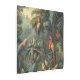 pintura vintage de una escena botánica de loros coloridos y piñas en una selva tropical