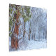 Una serena escena invernal se despliega en un bosque cubierto de nieve. En primer plano, un gran árbol enrollado con una corteza marrón rojiza ocupa un lugar destacado, con ramas que llegan hasta el cielo. El árbol está adornado con un polvo de nieve fresca, lo que aumenta su majestuosa presencia. El fondo está lleno de un denso bosque de árboles, sus ramas llenas de nieve, creando una atmósfera suave y etérea.