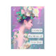 La decoración de las paredes. Arte inspirador. Alentamiento. Hermosa doncella asiática con flores en el pelo tocando el piano. Notas musicales y fondo morado floral. Arte femenino generativo