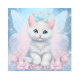 Un adorable gatito blanco de princesa de hadas con joyas, flores rosas y alas de hadas sobre un fondo azul brillante.