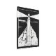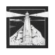 Ilustracion blanco y negro del faro situado en el extremo de la orilla de rocas en Nelson, Nueva Zelanda. Este faro está en el corte cerca y tiene la isla de la costa de ultramar al fondo.