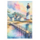 Esta serena pintura de faro costero captura el encanto tranquilo de vivir junto al mar con cielos pastel, dunas cubiertas de sol y aguas suavemente rizadas del océano. Un clásico faro a rayas observa junto a encantadoras cabañas de playa, con sus cálidas ventanas que brillan bajo un cielo acuarcal de suaves tonos rosa y azul. El pontón de madera conduce a los ojos hacia el horizonte, evocando el tranquilo ritmo de las mareas y las brisas saladas. Delicadas pinceladas y una paleta de ensueño le dan a esta pared náutica un ambiente nostálgico y apacible, perfecto para añadir una sensación de tranquilidad a los interiores costeros. Ideal para los amantes de los paisajes marítimos y de la belleza intemporal de las cabañas costeras al atardecer. La IA generó obras de arte.
