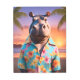 Gracioso hipopótamo usando una camisa hawaiana en una hermosa playa.