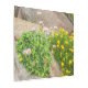 La imagen muestra un primer plano de flores silvestres creciendo en una roca. Las flores de la izquierda son margaritas de mar en púrpura claro con centros amarillos y hojas verdes. A la derecha, se encuentran los girasoles de color amarillo con hojas verdes. La roca es marrón claro y texturada. El lugar es luminoso y crea un ambiente natural y sereno.
