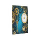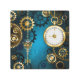 fondo turquesa, texturado, de vapor punk con bronce y oro, llave de plata y reloj. Estilo Steampunk.