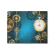 fondo turquesa, texturado, de vapor punk con bronce y oro, llave de plata y reloj. Estilo Steampunk.