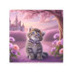 Una bonita escena con un gatito adorable vestido con un nuevo collar brillante frente a un castillo.