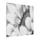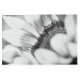Una fotografía de primer plano en monocromo muestra un girasol. Los pétalos son de color gris claro, se desvanecen en blanco en las puntas y se desdibujan ligeramente en primer plano. El centro del girasol es oscuro, con un patrón texturado de semillas y pequeñas estructuras. El fondo se desdibuja suavemente, creando una profundidad de campo poco profunda. La imagen tiene un ambiente sereno y natural.