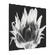 Una imagen monocroma de un girasol. La flor está en plena floración, con sus pétalos irradiando hacia afuera. La imagen es de alto contraste, con la flor que aparece brillante sobre un fondo negro sólido. Los pétalos tienen un aspecto texturado, con venas visibles y sutiles variaciones en el tono. El ambiente general es dramático y pone de relieve los detalles intrincados de la flor.