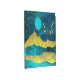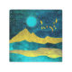 Resumen de diseño de paisajes montañosos en tonos audaces de oro, cian y azul con un amanecer, estrellas y pájaros.