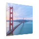 El icónico puente Golden Gate se extiende a lo largo del agua, con su estructura de acero rojo que contrasta con los tonos suaves de un cielo al amanecer. Las torres del puente y los cables de suspensión son visibles en detalle, mientras que el paisaje urbano de San Francisco se puede ver a lo lejos. El agua de abajo es un azul tranquilo que refleja los colores del cielo.