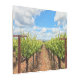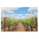 La imagen muestra un viñedo con hileras de viñas que se extienden a lo lejos bajo un cielo azul brillante salpicado de nubes blancas onduladas. Las viñas están repletas de hojas verdes, sostenidas por postes y alambres marrones. El suelo entre las filas está cubierto de hojas secas y suelo.