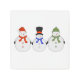 Tres lindos hombres de nieve con pañuelos y cada uno con un traje especial decorado. Un sombrero de Santa, una abeja y un sombrero de punta.