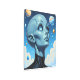 Arte mural de la fología. Un hermoso ser extraterrestre extraterrestre extraterrestre femenino con grandes ojos azules mirando hacia el espacio en las estrellas y planetas.