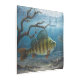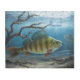 Beneath frozen water, a perch fish notices bait cast by someone ice fishing above.