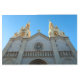 La imagen muestra una gran iglesia con dos destacadas torres, capturadas desde un ángulo bajo. La iglesia está construida en piedra gris claro, con detalles arquitectónicos intrincados como una ventana de rosa, puertas abovedadas y molduras decorativas. Una cruz dorada adorna la parte superior de la iglesia, situada entre las dos torres. Las torres incluyen caras de reloj y arañas ornamentadas.