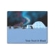 Una pintura digital que muestra un iglú en la capa de hielo polar, perros trinados y un hombre inuit en una parka. Las luces del norte brillan sobre sus cabezas. Añade tu propio texto.