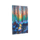 Un ilustracion invernal que es un diseño intrincado y simétrico con imágenes vívidas, biomórficas y colores vibrantes. La paleta de colores combina los tonos azules y violetas para evocar un tema invernal, así como otros colores, principalmente naranjas, que complementan y contrastan con estos tonos. En general, este diseño es un arte impresionante y llamativo.
