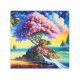 Una hermosa pintura digital de una exuberante isla verde en medio del océano. La isla está cubierta de árboles frondosos y flores, y el agua es azul claro. Un pequeño barco está anclado en la bahía y algunos se relajan en la playa. Este cuadro es perfecto para quien quiera escapar a un paraíso tropical.
