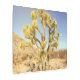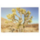 La imagen muestra un árbol Joshua en un paisaje desértico bajo un cielo azul claro. El árbol tiene un tronco grueso y texturado y ramas adornadas con racimos de hojas verdes y espesas. El terreno circundante es árido, con una vegetación seca y marrón y una cordillera distante visible en el fondo. El conjunto es cálido y soleado, lo que da una sensación de la belleza y la dureza del desierto.