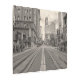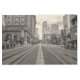 Esta fotografía de color sepia captura una vista callejera vacía en San Francisco durante la pandemia de 2020. La calle se extiende a lo lejos, flanqueada por grandes edificios a ambos lados. Las vías de tranvía recorren el centro de la carretera y llevan la vista hacia el horizonte. Las aceras están bordeadas de palmeras y farolas, lo que contribuye al paisaje urbano. El cielo está nublado, arrojando una luz suave sobre la escena.