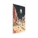 Un valle extraterrestre desolado se extiende bajo un cielo lleno de estrellas, con imponentes formaciones rojas enmarcando el paisaje árido. Se cierne sobre el terreno escarpado una inmensa luna resplandeciente. Este vintage ilustracion de ciencia ficción, inspirado en el arte clásico de la ficción pulp, evoca el misterio y la aventura de la exploración planetaria, transportando a los espectadores a un mundo inexplorado donde lo desconocido espera.