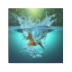 Esta pintura digital captura la inmersión precisa de un pescador de canes en el agua, creando un vibrante salpicón. Las obras de arte muestran el intenso plumaje del ave, las intrincadas burbujas de agua y el tranquilo fondo azul-verde, resaltando la belleza de la naturaleza y la habilidad de caza del kingfisher.