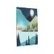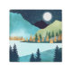 Un hermoso paisaje con texturas únicas que muestran un paisaje de lago montañoso con una luna en alza y un cielo estrellado en tonos azules, dorados, verdes y turquesas.