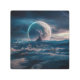 Un paisaje con una enorme luna resplandeciente en el centro del marco, perfectamente circular y etéreo con una brillante iluminación blanco-azul. La luna está parcialmente oscurecida por nubes opacas de color rosa y blanco. En primer plano, un paisaje extraño desolado se extiende a través del marco, compuesto por formaciones rocosas, montañas y valles en tonos suaves azul-gris.