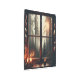 The scene features a picturesque view of a dense pine and maple forest bathed in a fine layer of fog and rain. The viewer’s perspective is from the interior of a quaint cabin, framed by a wooden window with age-worn grain, giving it a nostalgic charm. Water droplets streak across the glass as if time stands still, creating a visual interplay between interior warmth and exterior serenity. This piece encapsulates the emotional comfort of rainy days spent indoors — a perfect blend of stillness and movement.