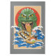 Gracioso ilustracion personalizado de un hambriento monstruo marino japonés atacando un bote de sushi. ¡Los personajes de sushi están chapoteando para salvar su vida de la criatura gigante! Impresión metalizado para los amantes del sushi.