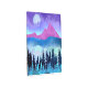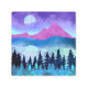 Un paisaje abstracto con colores y texturas únicos que muestran una escena montañosa con árboles y niebla en tonos púrpura, azul, verde azulado y cian.
