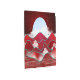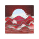 Resumen de diseño paisajístico en varios tonos de rojo con un amanecer, colinas, árboles, nubes y pájaros.