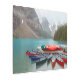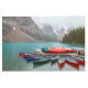 La imagen muestra una serena vista del lago Moraine con varias canoas atracadas en un muelle de madera. Las canoas están decoradas con colores variados, como el rojo, el naranja, el verde y el azul. El agua del lago es de un impresionante color turquesa, que contrasta con el paisaje de los alrededores. En el fondo, las montañas se ven parcialmente oscurecidas por la niebla y las nubes.