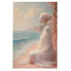 fascinante obra de arte de fantasía con una mujer etérea cubierta de tela fluida, sentada tranquilamente en una suave playa rosa con olas suaves y peces flotantes en el aire. Rodeado de flores florecientes y tonos pastel, esta escena costera surrealista irradia serenidad y asombro. Perfecto para los amantes de la fantasía, los sueños románticos y el arte surrealista suave, ideal para impresiones, decoración de paredes y accesorios elegantes.