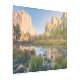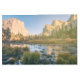La imagen captura un paisaje sereno que presenta el río Merced fluyendo a través del valle Yosemite. El icónico El Capitan y las Rocas Catedrales se elevan en el fondo, bañadas por la cálida luz del sol. El lecho del río está lleno de piedras lisas y en las orillas crecen grupos de hierba verde y marrón. Árboles con follaje otoñal bordean el río, agregando color a la escena.