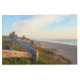 Vista panorámica de una playa en Point Reyes al atardecer, con una valla de madera en primer plano. La valla está rodeada de vegetación verde con higo marino chileno y flores rosas. Más allá de la valla, una playa de arena se extiende a lo largo de la costa y se une al océano. El cielo es una mezcla suave de tonos azules y naranjas a partir de la puesta de sol.