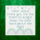 Monogramado para que insertes tu propia oración si así lo eliges, impresión metalizado. Este adorable tema de boho con arcos verdes y corazones, y texto verde sobre un fondo blanco, dice, Querido Jesús, gracias por las estrellas tan brillantes. Mantenme a salvo toda la noche.