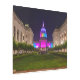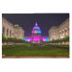 Una fotografía nocturna captura el ayuntamiento de San Francisco bañado en vibrantes colores arcoiris, simbolizando inclusión y orgullo. La cúpula icónica, un rasgo arquitectónico prominente, está iluminada en un suave tono violeta. La fachada del edificio está decorada con una gran variedad de colores, lo que crea una impresionante pantalla visual.