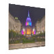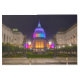 Una fotografía nocturna captura el ayuntamiento de San Francisco bañado en vibrantes colores arcoiris, simbolizando inclusión y orgullo. La cúpula icónica, un rasgo arquitectónico prominente, está iluminada en un suave tono violeta. La fachada del edificio está decorada con una gran variedad de colores, lo que crea una impresionante pantalla visual.
